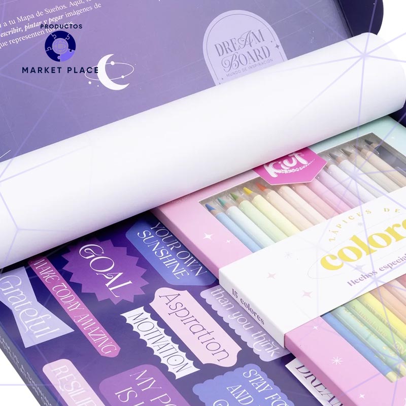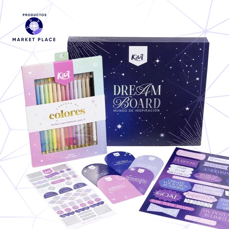 ¡NUEVO! Kiut te acompaña a seguir todos tus sueños. El Dream Board Kiut es una herramienta poderosa diseñada para ayudarte a visualizar, perseguir y alcanzar esos sueños que anidan en tu corazón. Contiene elementos cuidadosamente seleccionados para nutrir tu creatividad y empoderarte hacia el cielo de tus aspiraciones. Dentro de este mágio kit, encontrarás: – 1 Mapa de sueños. – 5 Tarjetas de afirmación. – 5 Hojas de stickers. – 5 Páginas de inspiración. – 1 Caja de Colores Kiut x15